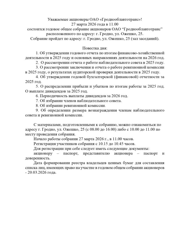 Уважаемые акционеры ОАО «Гроднооблавтотранс»! 27 марта 2026 года в 11.00 состоится годовое общее собрание акционеров ОАО “Гроднооблавтотранс”. Созданно: 24.02.2026 Автор: op_markУважаемые акционеры ОАО «Гроднооблавтотранс»! 27 марта 2026 года в 11.00 состоится годовое общее собрание акционеров ОАО “Гроднооблавтотранс”.
