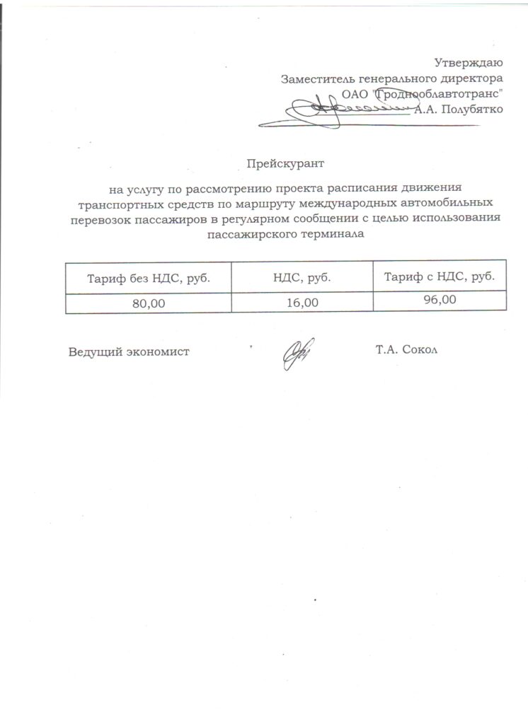 Прейскурант цен (тарифов) на оказание услугиБанковские реквизиты ОАО «Гроднооблавтотранс»: ОАО «Гроднооблавтотранс» р/с BY92BPSB30121267970119330000 ОАО «Сбер Банк», БИК: BPSBBY2X.